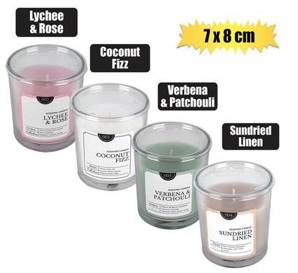 | Description | Candle in holder gls round 7x8cm scented |